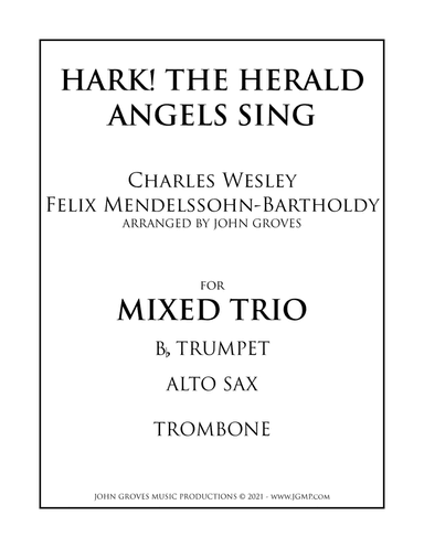 Alto Saxophone,Trombone,Trumpet - Level 3 - Digital Download SKU: A0.784024 Composed by Charles Wesley, Felix Mendelssonhn -Bartholdy. Arranged by John Groves. Christmas,Holiday,Praise & Worship,Religious,Sacred. 4 pages. John Groves #6635637. Published by John Groves (A0.784024). Hark! The Herald Angels Sing - arranged for Mixed TrioScore only:Bb TrumpetAlto SaxTrombone. This product was created by a member of ArrangeMe, Hal Leonard’s global self-publishing community of independent composers, arrangers, and songwriters. ArrangeMe allows for the publication of unique arrangements of both popular titles and original compositions from a wide variety of voices and backgrounds. About Digital Downloads Digital Downloads are downloadable sheet music files that can be viewed directly on your computer, tablet or mobile device. Once you download your digital sheet music, you can view and print it at home, school, or anywhere you want to make music, and you don’t have to be connected to the internet. Just purchase, download and play! PLEASE NOTE: Your Digital Download will have a watermark at the bottom of each page that will include your name, purchase date and number of copies purchased. You are only authorized to print the number of copies that you have purchased. You may not digitally distribute or print more copies than purchased for use (i.e., you may not print or digitally distribute individual copies to friends or students).