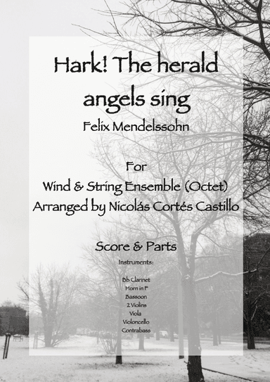 Large Ensemble Bassoon,Cello,Clarinet,Double Bass,Horn,Viola,Violin - Level 3 - Digital Download SKU: A0.1154372 Composed by Felix Bartholdy Mendelssohn. Arranged by Nicolás Cortés Castillo. Christmas,Sacred. Score and parts. 11 pages. Nicolas Ernesto Cortes Castillo #754654. Published by Nicolas Ernesto Cortes Castillo (A0.1154372). Hark! The Herald Angels Sing (Traditional Christmas Carol) by Felix Mendelssohn, arranged for wind & string ensemble (octet). In G Major. For Bb clarinet, bassoon, horn in F, 2 violins, viola, violoncello, contrabass. Full score and parts included. Approximate duration: 2 min. This product was created by a member of ArrangeMe, Hal Leonard's global self-publishing community of independent composers, arrangers, and songwriters. ArrangeMe allows for the publication of unique arrangements of popular titles and original compositions from a variety of voices and backgrounds. The length, difficulty, and retail pricing are determined solely by the discretion of the person who arranged or composed it. About Digital Downloads Digital Downloads are downloadable sheet music files that can be viewed directly on your computer, tablet or mobile device. Once you download your digital sheet music, you can view and print it at home, school, or anywhere you want to make music, and you don’t have to be connected to the internet. Just purchase, download and play! PLEASE NOTE: Your Digital Download will have a watermark at the bottom of each page that will include your name, purchase date and number of copies purchased. You are only authorized to print the number of copies that you have purchased. You may not digitally distribute or print more copies than purchased for use (i.e., you may not print or digitally distribute individual copies to friends or students).