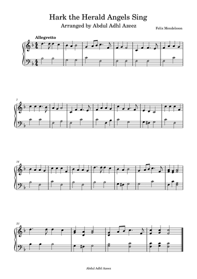 Easy Piano - Level 1 - Digital Download SKU: A0.1004282 Composed by Felix Mendelsson. Arranged by Abdul Adhl Azeez. Christian,Christmas,Classical,Spiritual. Score. 1 pages. Abdul Adhl Azeez #6612765. Published by Abdul Adhl Azeez (A0.1004282). Hark the Herald Angels Sing Piano Sheet Music Easy BeginnerArranged by Abdul Adhl Azeez, this song is the easy version of the popular Christmas Carol, Hark The Herlad Angels sing. The peice does not contain any hard parts and has a nice intro. Chords are kept to a minimum and the piece modulates in certain bars to fill out the music.Important DetailsKey Signature: F MajorTime Signature: 4/4 This product was created by a member of ArrangeMe, Hal Leonard's global self-publishing community of independent composers, arrangers, and songwriters. ArrangeMe allows for the publication of unique arrangements of popular titles and original compositions from a variety of voices and backgrounds. The length, difficulty, and retail pricing are determined solely by the discretion of the person who arranged or composed it. About Digital Downloads Digital Downloads are downloadable sheet music files that can be viewed directly on your computer, tablet or mobile device. Once you download your digital sheet music, you can view and print it at home, school, or anywhere you want to make music, and you don’t have to be connected to the internet. Just purchase, download and play! PLEASE NOTE: Your Digital Download will have a watermark at the bottom of each page that will include your name, purchase date and number of copies purchased. You are only authorized to print the number of copies that you have purchased. You may not digitally distribute or print more copies than purchased for use (i.e., you may not print or digitally distribute individual copies to friends or students).