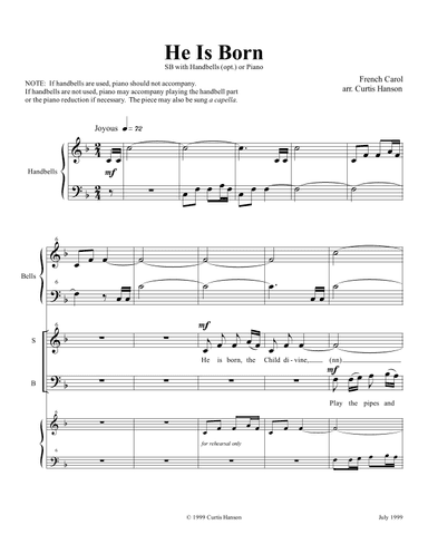 Choral Choir - Level 1 - Digital Download SKU: A0.1141983 Composed by French carol. Arranged by Curtis Hanson. Christmas,Holiday,Sacred. Octavo. 8 pages. Curtis Hanson #742359. Published by Curtis Hanson (A0.1141983). In this post-pandemic era, demand for octavos for smaller choirs is on the rise. Here is an arrangement for 2 part mixed voices of a familiar French carol with optional handbells. If handbells are not used, piano may accompany playing the handbell part (preferred) or double the choral part in the accompaniment as needed. It could also be sung a capella. This charming carol is vocally not difficult but may present some challenges for the bells, if used. This would be a welcome addition to the library with minimal voices. It would also work as a duet. It is also available in other, more expanded voicings. This product was created by a member of ArrangeMe, Hal Leonard’s global self-publishing community of independent composers, arrangers, and songwriters. ArrangeMe allows for the publication of unique arrangements of both popular titles and original compositions from a wide variety of voices and backgrounds. About Digital Downloads Digital Downloads are downloadable sheet music files that can be viewed directly on your computer, tablet or mobile device. Once you download your digital sheet music, you can view and print it at home, school, or anywhere you want to make music, and you don’t have to be connected to the internet. Just purchase, download and play! PLEASE NOTE: Your Digital Download will have a watermark at the bottom of each page that will include your name, purchase date and number of copies purchased. You are only authorized to print the number of copies that you have purchased. You may not digitally distribute or print more copies than purchased for use (i.e., you may not print or digitally distribute individual copies to friends or students).