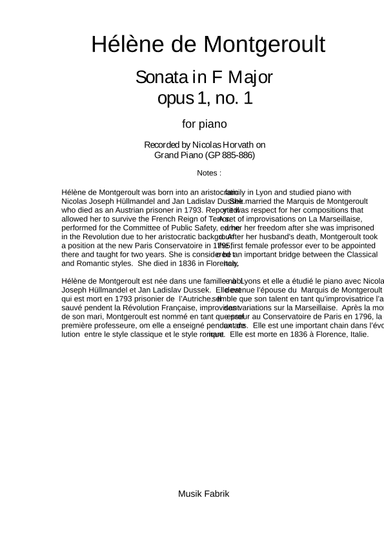 Piano Solo - Digital Download SKU: A0.507108 By Nicolas Horvath. By Hélènede Monteroult. Arranged by Paul Wehage (editor). Classical. Score. 17 pages. Published by Musik Fabrik Music Publishing (A0.507108). Hélène de Montgeroult was born into an aristocratic family in Lyon and studied piano with Nicolas Joseph Hüllmandel and Jan Ladislav Dussek. She married the Marquis de Montgeroult who died as an Austrian prisoner in 1793. Reportedly it was respect for her compositions that allowed her to survive the French Reign of Terror. A set of improvisations on La Marseillaise, performed for the Committee of Public Safety, earned her her freedom after she was imprisoned in the Revolution due to her aristocratic background. After her husband's death, Montgeroult took a position at the new Paris Conservatoire in 1795, the first female professor ever to be appointed there and taught for two years. She is considered to be an important bridge between the Classical and Romatnic styles. She died in 1836 in Florence, Italy. Recorded for Grand Piano by Nicolas Horvath. This product was created by a member of ArrangeMe, Hal Leonard’s global self-publishing community of independent composers, arrangers, and songwriters. ArrangeMe allows for the publication of unique arrangements of both popular titles and original compositions from a wide variety of voices and backgrounds. About Digital Downloads Digital Downloads are downloadable sheet music files that can be viewed directly on your computer, tablet or mobile device. Once you download your digital sheet music, you can view and print it at home, school, or anywhere you want to make music, and you don’t have to be connected to the internet. Just purchase, download and play! PLEASE NOTE: Your Digital Download will have a watermark at the bottom of each page that will include your name, purchase date and number of copies purchased. You are only authorized to print the number of copies that you have purchased. You may not digitally distribute or print more copies than purchased for use (i.e., you may not print or digitally distribute individual copies to friends or students).