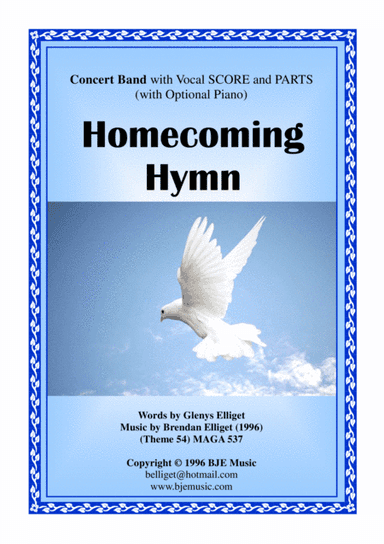 Choral Choir (Unison) - Level 3 - Digital Download SKU: A0.750773 Composed by Brendan Elliget MAGA 537. Christian,Sacred. Octavo. 46 pages. BJE Music #3560003. Published by BJE Music (A0.750773). Homecoming Hymn - Concert Band (with Vocal) Score and Parts PDFI wrote this tune in 1996 and gave it the title of "Homecoming Hymn" with no words in mind. I asked my wife Glenys to write some suitable words. She did, and what beautiful and appropriate words they are! A piano part and vocal lead sheet are also included in the PDF.Parts for Eb and F Horns, Bb and Eb Basses also included.This is a fairly straightforward arrangement for concert band of my original tune and could also be used to accompany a solo voice or congregational singing. A Piano part is included on the score...The MP3 was recorded with NotePerformer 3.Grade = 3  Duration = 2:40 mins. This product was created by a member of ArrangeMe, Hal Leonard's global self-publishing community of independent composers, arrangers, and songwriters. ArrangeMe allows for the publication of unique arrangements of popular titles and original compositions from a variety of voices and backgrounds. The length, difficulty, and retail pricing are determined solely by the discretion of the person who arranged or composed it. About Digital Downloads Digital Downloads are downloadable sheet music files that can be viewed directly on your computer, tablet or mobile device. Once you download your digital sheet music, you can view and print it at home, school, or anywhere you want to make music, and you don’t have to be connected to the internet. Just purchase, download and play! PLEASE NOTE: Your Digital Download will have a watermark at the bottom of each page that will include your name, purchase date and number of copies purchased. You are only authorized to print the number of copies that you have purchased. You may not digitally distribute or print more copies than purchased for use (i.e., you may not print or digitally distribute individual copies to friends or students).