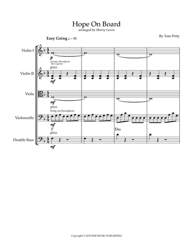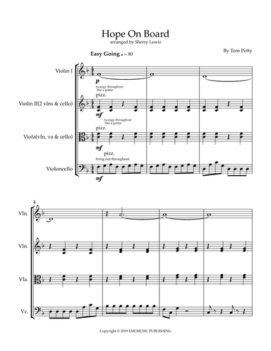 Cello,Instrumental Duet,Violin - Level 3 - Digital Download SKU: A0.1110654 Composed by Tom Petty. Arranged by Sherry Lewis. Film/TV,Wedding. 9 pages. Sherry Lewis Publishing #712956. Published by Sherry Lewis Publishing (A0.1110654). Hope On Board, Tom Petty (1 min. 14 seconds- it’s short!) STRING DUO Intermediate Level for violin and cello Score: Yes Parts: 2 pages Time: 1:14 ABOUT THE DEMO: The beginning was edited down to get to the main theme in the demo. MY QUARTET VERSIONS, in short notice work fine for solo, two parts and three parts however I also offer individual versions for one, two and three parts that are more detailed for these ensembles. Please visit https://www.sheetmusicplus.com/search?Ntt=sherry+lewis+publishing for all of the titles I offer. If you can’t find a title then contact me through https://baysbest.com/contact/and I’ll give you the link back to Sheet Music Plus’s listing. Sherry Lewis is a professional arranger and musician residing in Northern California. Thank you for your purchase! This product was created by a member of ArrangeMe, Hal Leonard’s global self-publishing community of independent composers, arrangers, and songwriters. ArrangeMe allows for the publication of unique arrangements of both popular titles and original compositions from a wide variety of voices and backgrounds. About Digital Downloads Digital Downloads are downloadable sheet music files that can be viewed directly on your computer, tablet or mobile device. Once you download your digital sheet music, you can view and print it at home, school, or anywhere you want to make music, and you don’t have to be connected to the internet. Just purchase, download and play! PLEASE NOTE: Your Digital Download will have a watermark at the bottom of each page that will include your name, purchase date and number of copies purchased. You are only authorized to print the number of copies that you have purchased. You may not digitally distribute or print more copies than purchased for use (i.e., you may not print or digitally distribute individual copies to friends or students).