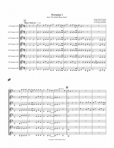 Brass Ensemble Trumpet - Level 3 - Digital Download SKU: A0.812942 Composed by George Frideric Handel. Arranged by Regis Bookshar. Baroque,Multicultural,Standards,Wedding,World. Score and parts. 11 pages. Regis Bookshar #5791769. Published by Regis Bookshar (A0.812942). Trumpet Octet - Intermediate - Digital Download. This famous Hornpipe from Handel's "Water Music" has been arranged for 8 Trumpets by Regis Bookshar and is one of the many arrangements from The Regis Bookshar Trumpet Ensemble's extensive music library being made available for the first time. It is suitable for high school and college students and could be performed for concerts, church services and other festive occasions. Included is a score and a complete set of parts (11 pages). Please feel free to search for other arrangements by Regis Bookshar. You may find something else which might interest you as well. I'm certain that audiences will enjoy hearing this selection. This product was created by a member of ArrangeMe, Hal Leonard's global self-publishing community of independent composers, arrangers, and songwriters. ArrangeMe allows for the publication of unique arrangements of popular titles and original compositions from a variety of voices and backgrounds. The length, difficulty, and retail pricing are determined solely by the discretion of the person who arranged or composed it. About Digital Downloads Digital Downloads are downloadable sheet music files that can be viewed directly on your computer, tablet or mobile device. Once you download your digital sheet music, you can view and print it at home, school, or anywhere you want to make music, and you don’t have to be connected to the internet. Just purchase, download and play! PLEASE NOTE: Your Digital Download will have a watermark at the bottom of each page that will include your name, purchase date and number of copies purchased. You are only authorized to print the number of copies that you have purchased. You may not digitally distribute or print more copies than purchased for use (i.e., you may not print or digitally distribute individual copies to friends or students).