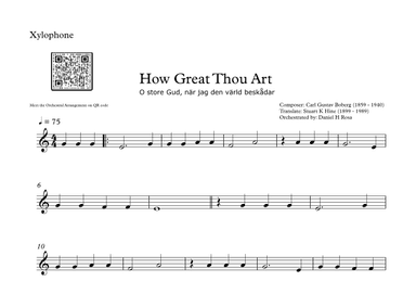 Xylophone Solo - Level 1 - Digital Download SKU: A0.1155894 Composed by Carl Gustav Boberg /Stuart K Hine. Arranged by Daniel H Rosa. Christian,Easter,Praise & Worship,Religious,Sacred. 1 pages. Daniel H Rosa #756202. Published by Daniel H Rosa (A0.1155894). Easy Begginer solo. This product was created by a member of ArrangeMe, Hal Leonard's global self-publishing community of independent composers, arrangers, and songwriters. ArrangeMe allows for the publication of unique arrangements of popular titles and original compositions from a variety of voices and backgrounds. The length, difficulty, and retail pricing are determined solely by the discretion of the person who arranged or composed it. About Digital Downloads Digital Downloads are downloadable sheet music files that can be viewed directly on your computer, tablet or mobile device. Once you download your digital sheet music, you can view and print it at home, school, or anywhere you want to make music, and you don’t have to be connected to the internet. Just purchase, download and play! PLEASE NOTE: Your Digital Download will have a watermark at the bottom of each page that will include your name, purchase date and number of copies purchased. You are only authorized to print the number of copies that you have purchased. You may not digitally distribute or print more copies than purchased for use (i.e., you may not print or digitally distribute individual copies to friends or students).