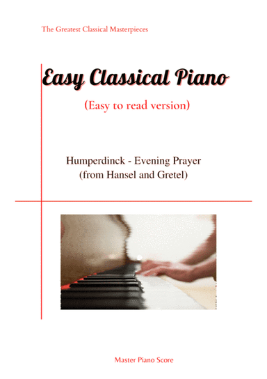 Easy Piano - Level 2 - Digital Download SKU: A0.657788 Composed by Engelbert Humperdinck. Arranged by MPS. Classical. Score. 3 pages. Classic Piano sheetz #6245869. Published by Classic Piano sheetz (A0.657788). Humperdinck - Evening Prayer (from Hansel and Gretel)(Easy piano version). This product was created by a member of ArrangeMe, Hal Leonard’s global self-publishing community of independent composers, arrangers, and songwriters. ArrangeMe allows for the publication of unique arrangements of both popular titles and original compositions from a wide variety of voices and backgrounds. About Digital Downloads Digital Downloads are downloadable sheet music files that can be viewed directly on your computer, tablet or mobile device. Once you download your digital sheet music, you can view and print it at home, school, or anywhere you want to make music, and you don’t have to be connected to the internet. Just purchase, download and play! PLEASE NOTE: Your Digital Download will have a watermark at the bottom of each page that will include your name, purchase date and number of copies purchased. You are only authorized to print the number of copies that you have purchased. You may not digitally distribute or print more copies than purchased for use (i.e., you may not print or digitally distribute individual copies to friends or students).