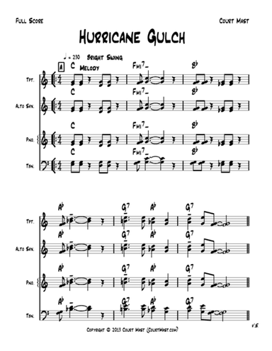 Jazz Combo - Level 5 - Digital Download SKU: A0.800648 Composed by Court Mast. Blues,Contest,Festival,Instructional,Jazz,Standards. Score and parts. 14 pages. Court Mast #2010861. Published by Court Mast (A0.800648). An up-tempo bebop romp that’s challenging for even the best players. This mash-up combines a melody derived from a ’40s show tune with the chords from a light ballad done by a ’60s rock group. Can you guess the two original songs? A single PDF file includes concert-pitch Score and transposed parts for Trumpet, Alto Sax, Piano, Trombone. Can be played by any combination of instruments. This product was created by a member of ArrangeMe, Hal Leonard’s global self-publishing community of independent composers, arrangers, and songwriters. ArrangeMe allows for the publication of unique arrangements of both popular titles and original compositions from a wide variety of voices and backgrounds. About Digital Downloads Digital Downloads are downloadable sheet music files that can be viewed directly on your computer, tablet or mobile device. Once you download your digital sheet music, you can view and print it at home, school, or anywhere you want to make music, and you don’t have to be connected to the internet. Just purchase, download and play! PLEASE NOTE: Your Digital Download will have a watermark at the bottom of each page that will include your name, purchase date and number of copies purchased. You are only authorized to print the number of copies that you have purchased. You may not digitally distribute or print more copies than purchased for use (i.e., you may not print or digitally distribute individual copies to friends or students).