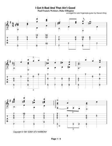 Solo Guitar - Level 5 - Digital Download SKU: A0.492014 Composed by Duke Ellington and Paul Francis Webster. Arranged by Steven King. Standards. Individual part. 4 pages. STEVEN KING #107419. Published by STEVEN KING (A0.492014). Solo Fingerstyle Guitar includes treble and tab clefs, arranged by Winfield Championship Winner Steven King, in his style that creates simultaneous melody, bass lines, chords and rhythms. For the TEF file visit Fingerstyle College at kingofguitar.com. This product was created by a member of ArrangeMe, Hal Leonard’s global self-publishing community of independent composers, arrangers, and songwriters. ArrangeMe allows for the publication of unique arrangements of both popular titles and original compositions from a wide variety of voices and backgrounds. About Digital Downloads Digital Downloads are downloadable sheet music files that can be viewed directly on your computer, tablet or mobile device. Once you download your digital sheet music, you can view and print it at home, school, or anywhere you want to make music, and you don’t have to be connected to the internet. Just purchase, download and play! PLEASE NOTE: Your Digital Download will have a watermark at the bottom of each page that will include your name, purchase date and number of copies purchased. You are only authorized to print the number of copies that you have purchased. You may not digitally distribute or print more copies than purchased for use (i.e., you may not print or digitally distribute individual copies to friends or students).