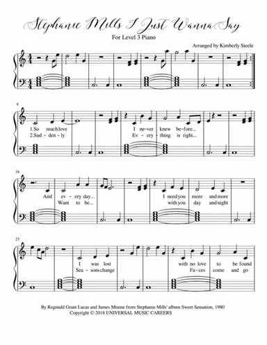Piano Solo - Level 1 - Digital Download SKU: A0.733363 Composed by James Mtume and Reginald Grant Lucas. Arranged by Kimberly Steele. Contemporary. Score. 3 pages. Kimberly Steele #4888445. Published by Kimberly Steele (A0.733363). A beautiful song from 1980s R&B superstar Stephanie Mills from her album, Sweet Sensation.  I am an independent piano teacher with my own studio in the Chicago area and my student requested that I arrange this song. . This product was created by a member of ArrangeMe, Hal Leonard's global self-publishing community of independent composers, arrangers, and songwriters. ArrangeMe allows for the publication of unique arrangements of popular titles and original compositions from a variety of voices and backgrounds. The length, difficulty, and retail pricing are determined solely by the discretion of the person who arranged or composed it. About Digital Downloads Digital Downloads are downloadable sheet music files that can be viewed directly on your computer, tablet or mobile device. Once you download your digital sheet music, you can view and print it at home, school, or anywhere you want to make music, and you don’t have to be connected to the internet. Just purchase, download and play! PLEASE NOTE: Your Digital Download will have a watermark at the bottom of each page that will include your name, purchase date and number of copies purchased. You are only authorized to print the number of copies that you have purchased. You may not digitally distribute or print more copies than purchased for use (i.e., you may not print or digitally distribute individual copies to friends or students).