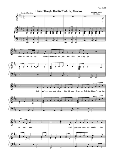 Piano,Vocal,Voice - Level 2 - Digital Download SKU: A0.1266176 By None. By C.R.Clifton. Arranged by C.R.Clifton. 20th Century. Score. 5 pages. Colin Clifton #858921. Published by Colin Clifton (A0.1266176). Break up song, play with feeling. no strict tempo, guide only. This product was created by a member of ArrangeMe, Hal Leonard's global self-publishing community of independent composers, arrangers, and songwriters. ArrangeMe allows for the publication of unique arrangements of popular titles and original compositions from a variety of voices and backgrounds. The length, difficulty, and retail pricing are determined solely by the discretion of the person who arranged or composed it. About Digital Downloads Digital Downloads are downloadable sheet music files that can be viewed directly on your computer, tablet or mobile device. Once you download your digital sheet music, you can view and print it at home, school, or anywhere you want to make music, and you don’t have to be connected to the internet. Just purchase, download and play! PLEASE NOTE: Your Digital Download will have a watermark at the bottom of each page that will include your name, purchase date and number of copies purchased. You are only authorized to print the number of copies that you have purchased. You may not digitally distribute or print more copies than purchased for use (i.e., you may not print or digitally distribute individual copies to friends or students).