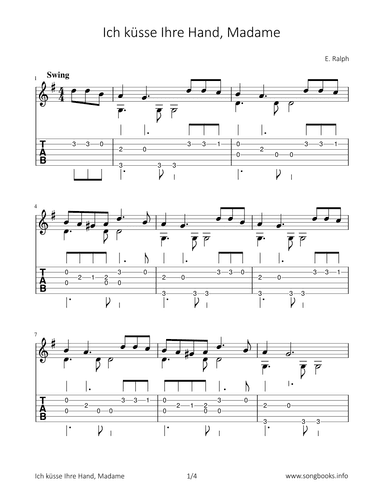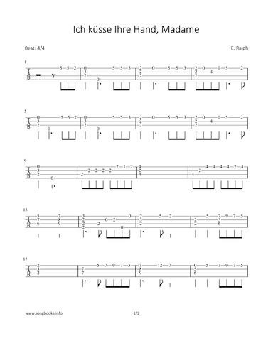 Ukulele - Level 4 - Digital Download SKU: A0.1314571 Composed by E. Ralph. Arranged by Bettina Schipp. 20th Century,Broadway,Musical/Show. Score. 2 pages. Songbooks.info #903325. Published by songbooks.info (A0.1314571). Arranged for the hottest four strings in music - the Ukulele.The evergreens come from composers from all over the world and were written for fingerpicking on the Ukulele - using the well-known tablature for string instruments. The songs are recorded at a slow tempo and with a sound that does not match the sound of the ukulele. Have fun making music...!Arrangiert für die heißesten vier Saiten in der Musik - für die Ukulele.Die Evergreens stammen von Komponisten aus der ganzen Welt und wurden für das Fingerpicking auf der Ukulele notiert - mit der bekannten Tabulatur für Saiteninstrumente. Die Vertonungen sind in einem langsamen Tempo und einem Sound aufgenommen, der sich nicht mit dem Sound der Ukulele deckt. Viel Spaß beim Musizieren...! This product was created by a member of ArrangeMe, Hal Leonard's global self-publishing community of independent composers, arrangers, and songwriters. ArrangeMe allows for the publication of unique arrangements of popular titles and original compositions from a variety of voices and backgrounds. The length, difficulty, and retail pricing are determined solely by the discretion of the person who arranged or composed it. About Digital Downloads Digital Downloads are downloadable sheet music files that can be viewed directly on your computer, tablet or mobile device. Once you download your digital sheet music, you can view and print it at home, school, or anywhere you want to make music, and you don’t have to be connected to the internet. Just purchase, download and play! PLEASE NOTE: Your Digital Download will have a watermark at the bottom of each page that will include your name, purchase date and number of copies purchased. You are only authorized to print the number of copies that you have purchased. You may not digitally distribute or print more copies than purchased for use (i.e., you may not print or digitally distribute individual copies to friends or students).