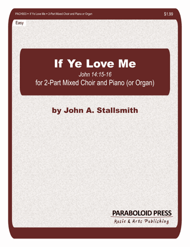 Choral Choir (2-Part) - Level 1 - Digital Download SKU: A0.1015412 Composed by John A. Stallsmith. Christian,Contemporary,Sacred,Spiritual. Octavo. 4 pages. Paraboloid Press #6669007. Published by Paraboloid Press (A0.1015412). John A. Stallsmith's elegant original setting of the famous text from John 14:15-16 for 2-part mixed choir is simple to learn but powerful in its musical effectiveness. The piano accompaniment can be easily adapted for organ. A perfect piece for situations with limited rehearsal time, or for choirs in rebuilding mode. Ideal for Pentecost or for general worship or concert use.For more information about Paraboloid Press, visit https://www.paraboloidpress.com. This product was created by a member of ArrangeMe, Hal Leonard's global self-publishing community of independent composers, arrangers, and songwriters. ArrangeMe allows for the publication of unique arrangements of popular titles and original compositions from a variety of voices and backgrounds. The length, difficulty, and retail pricing are determined solely by the discretion of the person who arranged or composed it. About Digital Downloads Digital Downloads are downloadable sheet music files that can be viewed directly on your computer, tablet or mobile device. Once you download your digital sheet music, you can view and print it at home, school, or anywhere you want to make music, and you don’t have to be connected to the internet. Just purchase, download and play! PLEASE NOTE: Your Digital Download will have a watermark at the bottom of each page that will include your name, purchase date and number of copies purchased. You are only authorized to print the number of copies that you have purchased. You may not digitally distribute or print more copies than purchased for use (i.e., you may not print or digitally distribute individual copies to friends or students).