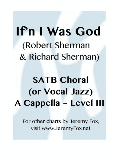 Choral Choir (SATB) - Level 3 - Digital Download SKU: A0.511093 Composed by Richard Sherman and Robert Sherman. Arranged by Jeremy Fox. A Cappella. Octavo. 5 pages. JEREMY S FOX #4108025. Published by JEREMY S FOX (A0.511093). Level III. SATB Choral Series, or Vocal Jazz. $75 – Digital Download (bulk price for as many copies as you need for your ensemble).Arranged by Jeremy Fox. Music and Lyrics by Robert Sherman and Richard Sherman. To see other arrangements of Jeremy Fox, visit www.JeremyFox.netThis song was written for the musical adaptation of "Tom Sawyer." The lyric of the song is a precious one, starting with "If'n I was god... I wouldn't set the sun at night, 'till everyone was treated right by everyone else they see." The message peaks with the thought that "everyone needs everyone." Jeremy Fox sets the song's lyric well, with equal parts lush harmony with simple harmonic passages. Your students will love the positive message of this piece! This product was created by a member of ArrangeMe, Hal Leonard’s global self-publishing community of independent composers, arrangers, and songwriters. ArrangeMe allows for the publication of unique arrangements of both popular titles and original compositions from a wide variety of voices and backgrounds. About Digital Downloads Digital Downloads are downloadable sheet music files that can be viewed directly on your computer, tablet or mobile device. Once you download your digital sheet music, you can view and print it at home, school, or anywhere you want to make music, and you don’t have to be connected to the internet. Just purchase, download and play! PLEASE NOTE: Your Digital Download will have a watermark at the bottom of each page that will include your name, purchase date and number of copies purchased. You are only authorized to print the number of copies that you have purchased. You may not digitally distribute or print more copies than purchased for use (i.e., you may not print or digitally distribute individual copies to friends or students).