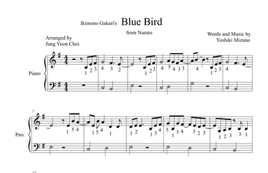 B-Flat Trumpet,Piano - Level 4 - Digital Download SKU: A0.1180353 Composed by Yoshiki Mizuno. Arranged by Fabio Britto. Children,Film/TV,Pop,Rock,Wedding. Score and part. 12 pages. Fabio Britto #780251. Published by Fabio Britto (A0.1180353). Arrangement of the song Blue Bird (from Naruto Shippuden Opening 3) for Trumpet in Bb Solo and Piano Accompaniment. This product was created by a member of ArrangeMe, Hal Leonard’s global self-publishing community of independent composers, arrangers, and songwriters. ArrangeMe allows for the publication of unique arrangements of both popular titles and original compositions from a wide variety of voices and backgrounds. About Digital Downloads Digital Downloads are downloadable sheet music files that can be viewed directly on your computer, tablet or mobile device. Once you download your digital sheet music, you can view and print it at home, school, or anywhere you want to make music, and you don’t have to be connected to the internet. Just purchase, download and play! PLEASE NOTE: Your Digital Download will have a watermark at the bottom of each page that will include your name, purchase date and number of copies purchased. You are only authorized to print the number of copies that you have purchased. You may not digitally distribute or print more copies than purchased for use (i.e., you may not print or digitally distribute individual copies to friends or students).