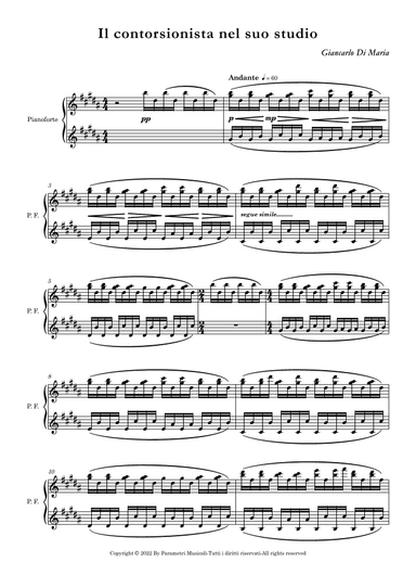 Piano Solo - Level 4 - Digital Download SKU: A0.1144234 By Giacomo Di Maria. By Giancarlo Di Maria. Classical. Score. 4 pages. Parametri Musicali #744555. Published by Parametri Musicali (A0.1144234). From " Le Piano de Magritte" 10 painting for piano music ISMN 9790705114096. This product was created by a member of ArrangeMe, Hal Leonard’s global self-publishing community of independent composers, arrangers, and songwriters. ArrangeMe allows for the publication of unique arrangements of both popular titles and original compositions from a wide variety of voices and backgrounds. About Digital Downloads Digital Downloads are downloadable sheet music files that can be viewed directly on your computer, tablet or mobile device. Once you download your digital sheet music, you can view and print it at home, school, or anywhere you want to make music, and you don’t have to be connected to the internet. Just purchase, download and play! PLEASE NOTE: Your Digital Download will have a watermark at the bottom of each page that will include your name, purchase date and number of copies purchased. You are only authorized to print the number of copies that you have purchased. You may not digitally distribute or print more copies than purchased for use (i.e., you may not print or digitally distribute individual copies to friends or students).