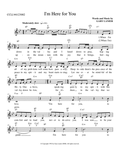 Guitar,Piano,Vocal,Voice - Level 2 - Digital Download SKU: A0.617453 Composed by Gary Lanier. Arranged by Gary Lanier. Christian,Gospel,Praise & Worship,Sacred. Score. 3 pages. The Lanier Company #5033951. Published by The Lanier Company (A0.617453). I'M HERE FOR YOU is a beautiful, inspirational song written by Gary Lanier. There are times when everything seems to be falling apart and people have disappointed you. It is during times like this that God wants you to remember that He has given you a Comforter, the Holy Spirit, and He is ALWAYS there for you. He will comfort and lead you, never deceive you. That's what this song is all about... God is saying to you, "I'M HERE FOR YOU."The following other products are available on Sheet Music Plus for I'M HERE FOR YOU:Listening MP3, listed as: I'M HERE FOR YOU, Listening MP3 (Artist, Gary Lanier).MP3 Accompaniment Track, listed as: I'M HERE FOR YOU by Gary Lanier, MP3 Accompaniment Track This product was created by a member of ArrangeMe, Hal Leonard's global self-publishing community of independent composers, arrangers, and songwriters. ArrangeMe allows for the publication of unique arrangements of popular titles and original compositions from a variety of voices and backgrounds. The length, difficulty, and retail pricing are determined solely by the discretion of the person who arranged or composed it. About Digital Downloads Digital Downloads are downloadable sheet music files that can be viewed directly on your computer, tablet or mobile device. Once you download your digital sheet music, you can view and print it at home, school, or anywhere you want to make music, and you don’t have to be connected to the internet. Just purchase, download and play! PLEASE NOTE: Your Digital Download will have a watermark at the bottom of each page that will include your name, purchase date and number of copies purchased. You are only authorized to print the number of copies that you have purchased. You may not digitally distribute or print more copies than purchased for use (i.e., you may not print or digitally distribute individual copies to friends or students).