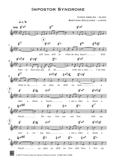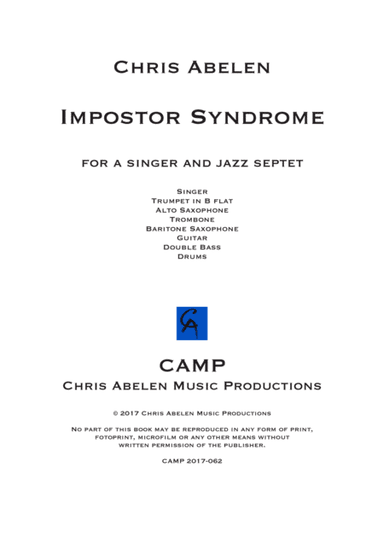 Jazz Ensemble Jazz Ensemble - Digital Download SKU: A0.1014000 Composed by Chris Abelen. Jazz,Pop. Score and parts. 36 pages. Chris Abelen Music Productions #6092961. Published by Chris Abelen Music Productions (A0.1014000). DESCRIPTIONFrom the album Songs on the eve of dismissal Impostor Syndrome. Impostor Syndrome is written for a singer & jazz septet [trumpet, alto sax, trombone, bass clarinet, electric guitar, bass & drums]. Alto sax solo. Impostor Syndrome can be heard on Chris Abelen & Bastiaan Geleijnse (lyrics) - Songs on the eve of dismissal [CAMP 008]. Free minus one tracks of the studio recordings of Songs on the eve of dismissal - Album on all major streaming services ffm.to/songsontheeveofdismissal This product was created by a member of ArrangeMe, Hal Leonard’s global self-publishing community of independent composers, arrangers, and songwriters. ArrangeMe allows for the publication of unique arrangements of both popular titles and original compositions from a wide variety of voices and backgrounds. About Digital Downloads Digital Downloads are downloadable sheet music files that can be viewed directly on your computer, tablet or mobile device. Once you download your digital sheet music, you can view and print it at home, school, or anywhere you want to make music, and you don’t have to be connected to the internet. Just purchase, download and play! PLEASE NOTE: Your Digital Download will have a watermark at the bottom of each page that will include your name, purchase date and number of copies purchased. You are only authorized to print the number of copies that you have purchased. You may not digitally distribute or print more copies than purchased for use (i.e., you may not print or digitally distribute individual copies to friends or students).