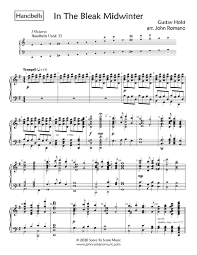 Handbell - Level 3 - Digital Download SKU: A0.874592 Composed by Gustav Holst. Arranged by John Romano. Christmas,Sacred,Spiritual. Score. 2 pages. John Romano #5209923. Published by John Romano (A0.874592). This arrangement of In The Bleak Midwinter by Gustav Holst is a perfect Advent or post-Chirstmas-winter-theme prelude or communion meditation. It was designed to be a "one rehearsal" piece that can still work with a missing ringer or two.One price - print all you want. This product was created by a member of ArrangeMe, Hal Leonard’s global self-publishing community of independent composers, arrangers, and songwriters. ArrangeMe allows for the publication of unique arrangements of both popular titles and original compositions from a wide variety of voices and backgrounds. About Digital Downloads Digital Downloads are downloadable sheet music files that can be viewed directly on your computer, tablet or mobile device. Once you download your digital sheet music, you can view and print it at home, school, or anywhere you want to make music, and you don’t have to be connected to the internet. Just purchase, download and play! PLEASE NOTE: Your Digital Download will have a watermark at the bottom of each page that will include your name, purchase date and number of copies purchased. You are only authorized to print the number of copies that you have purchased. You may not digitally distribute or print more copies than purchased for use (i.e., you may not print or digitally distribute individual copies to friends or students).