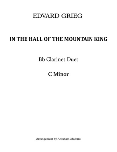 Clarinet Duet Clarinet - Level 3 - Digital Download SKU: A0.715639 Composed by Edvard Grieg. Arranged by Abraham Maduro. Broadway,Classical,Film/TV,Musical/Show,Standards. 2 scores. 8 pages. Abraham Maduro #6087449. Published by Abraham Maduro (A0.715639). In The Hall Of The Mountain King of Edvard Grieg Bb Clarinet Duet , in this piece the original melodic elements remain almost the same with some countermelodies and bass line added, both parts are musical, interesting and fun to play C minor, 2 minutes long approx, 4/4, Intermediate Level, special for concerts, recitals or just for have fun at home.If you have a question or any suggestion please contact me [email protected]. This product was created by a member of ArrangeMe, Hal Leonard’s global self-publishing community of independent composers, arrangers, and songwriters. ArrangeMe allows for the publication of unique arrangements of both popular titles and original compositions from a wide variety of voices and backgrounds. About Digital Downloads Digital Downloads are downloadable sheet music files that can be viewed directly on your computer, tablet or mobile device. Once you download your digital sheet music, you can view and print it at home, school, or anywhere you want to make music, and you don’t have to be connected to the internet. Just purchase, download and play! PLEASE NOTE: Your Digital Download will have a watermark at the bottom of each page that will include your name, purchase date and number of copies purchased. You are only authorized to print the number of copies that you have purchased. You may not digitally distribute or print more copies than purchased for use (i.e., you may not print or digitally distribute individual copies to friends or students).