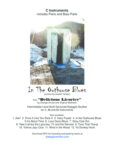 Jazz Combo - Level 4 - Digital Download SKU: A0.947495 Composed by George Arvola, Virginia Mathews. Blues,Concert,Holiday,Instructional,Standards. Score and parts. 7 pages. George Arvola and Virginia Mathews #496605. Published by George Arvola and Virginia Mathews (A0.947495). Includes piano accompaniment and bass parts. arpeggioartistry.com hosts the full recordings and complete list of fun arpeggio studies from our book, "Delicious Licorice". In the Outhouse Blues, 2:30 in length, is a relaxed 12 bar blues which explores the "outer fringes" of the standard chords. Each verse is slightly farther removed from the basic 7th chords. Roll up the newspaper and take careful aim at the flies. This product was created by a member of ArrangeMe, Hal Leonard’s global self-publishing community of independent composers, arrangers, and songwriters. ArrangeMe allows for the publication of unique arrangements of both popular titles and original compositions from a wide variety of voices and backgrounds. About Digital Downloads Digital Downloads are downloadable sheet music files that can be viewed directly on your computer, tablet or mobile device. Once you download your digital sheet music, you can view and print it at home, school, or anywhere you want to make music, and you don’t have to be connected to the internet. Just purchase, download and play! PLEASE NOTE: Your Digital Download will have a watermark at the bottom of each page that will include your name, purchase date and number of copies purchased. You are only authorized to print the number of copies that you have purchased. You may not digitally distribute or print more copies than purchased for use (i.e., you may not print or digitally distribute individual copies to friends or students).