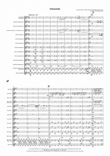 Small Ensemble Drum Set,Horn - Level 3 - Digital Download SKU: A0.1016495 By Queen. By Brian May, Freddie Mercury, John Deacon, and Roger Taylor. Arranged by Jonathan Serna. Rock. Score and parts. 20 pages. Jonathan Serna #5713265. Published by Jonathan Serna (A0.1016495). Innuendo by Queen. Arranged for 5 french horns and percussionist. This product was created by a member of ArrangeMe, Hal Leonard's global self-publishing community of independent composers, arrangers, and songwriters. ArrangeMe allows for the publication of unique arrangements of popular titles and original compositions from a variety of voices and backgrounds. The length, difficulty, and retail pricing are determined solely by the discretion of the person who arranged or composed it. About Digital Downloads Digital Downloads are downloadable sheet music files that can be viewed directly on your computer, tablet or mobile device. Once you download your digital sheet music, you can view and print it at home, school, or anywhere you want to make music, and you don’t have to be connected to the internet. Just purchase, download and play! PLEASE NOTE: Your Digital Download will have a watermark at the bottom of each page that will include your name, purchase date and number of copies purchased. You are only authorized to print the number of copies that you have purchased. You may not digitally distribute or print more copies than purchased for use (i.e., you may not print or digitally distribute individual copies to friends or students).
