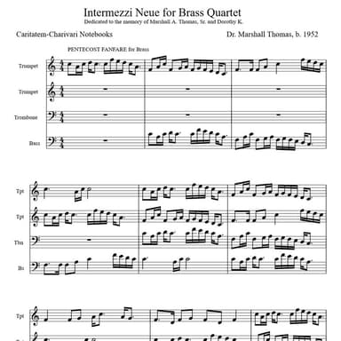 Small Ensemble Bass Guitar,Trombone,Trumpet - Level 5 - Interactive Download SKU: A0.497022 By Celebrity Chamber Players. By Marshall Thomas. This edition: Interactive Download. Classical,Contest. Score and parts. Duration 270. Father Ambrose Press #VmAB5tB7tf4hHLmfMk98k. Published by Father Ambrose Press (A0.497022). Key: C major.A collection of six intermezzi for small chamber ensemble, one composed as a tribute... This product was created by a member of ArrangeMe, Hal Leonard’s global self-publishing community of independent composers, arrangers, and songwriters. ArrangeMe allows for the publication of unique arrangements of both popular titles and original compositions from a wide variety of voices and backgrounds. About Interactive Downloads Interactive Downloads are dynamic sheet music files that can be viewed and altered directly in My Digital Library from any device. Interactive features include: playback, tempo control, transposition, melody instrument selection, adjustable note size, and full-screen viewing. Once you download your personalized sheet music, you can view and print it at home, school, or anywhere you want to make music, and you don’t have to be connected to the internet. Just purchase, download and play! PLEASE NOTE: All Interactive Downloads will have a watermark at the bottom of each page that will include your name, purchase date and number of copies purchased. You are only authorized to print the number of copies that you have purchased. You may not digitally distribute or print more copies than purchased for use (i.e., you may not print or digitally distribute individual copies to friends or students).