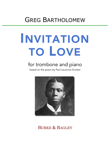 Piano,Trombone - Level 2 - Digital Download SKU: A0.787383 Composed by Greg Bartholomew. 20th Century,Concert,Contemporary,Holiday,Love. Score and part. 9 pages. Burke & Bagley #6270049. Published by Burke & Bagley (A0.787383). An adaptation for solo trombone with piano accompaniment of a setting of the poem Invitation to Love by Paul Laurence Dunbar (1872 - 1906). Dunbar was born in Dayton, Ohio, and gained fame as a a poet, novelist and playwright. He wrote the lyrics for the musical comedy In Dahomey (1903), the first all-African-American musical produced on Broadway. Duration: ca. 3'15"Watch a score video of the vocal version here:  https://youtu.be/hV8-mXG2o_Y This product was created by a member of ArrangeMe, Hal Leonard's global self-publishing community of independent composers, arrangers, and songwriters. ArrangeMe allows for the publication of unique arrangements of popular titles and original compositions from a variety of voices and backgrounds. The length, difficulty, and retail pricing are determined solely by the discretion of the person who arranged or composed it. About Digital Downloads Digital Downloads are downloadable sheet music files that can be viewed directly on your computer, tablet or mobile device. Once you download your digital sheet music, you can view and print it at home, school, or anywhere you want to make music, and you don’t have to be connected to the internet. Just purchase, download and play! PLEASE NOTE: Your Digital Download will have a watermark at the bottom of each page that will include your name, purchase date and number of copies purchased. You are only authorized to print the number of copies that you have purchased. You may not digitally distribute or print more copies than purchased for use (i.e., you may not print or digitally distribute individual copies to friends or students).