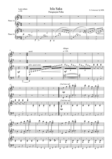 Instrumental Duet Instrumental Duet,Piano - Level 3 - Digital Download SKU: A0.968885 Composed by Santiago Cortesi. Arranged by M J regan. World. Score and parts. 5 pages. Michael Regan #6610045. Published by Michael Regan (A0.968885). Isla Saka is a Paraguayan Polka composed by S. Cortesi [1913-92] originally for harp. I have arranged it for piano duet. . This product was created by a member of ArrangeMe, Hal Leonard's global self-publishing community of independent composers, arrangers, and songwriters. ArrangeMe allows for the publication of unique arrangements of popular titles and original compositions from a variety of voices and backgrounds. The length, difficulty, and retail pricing are determined solely by the discretion of the person who arranged or composed it. About Digital Downloads Digital Downloads are downloadable sheet music files that can be viewed directly on your computer, tablet or mobile device. Once you download your digital sheet music, you can view and print it at home, school, or anywhere you want to make music, and you don’t have to be connected to the internet. Just purchase, download and play! PLEASE NOTE: Your Digital Download will have a watermark at the bottom of each page that will include your name, purchase date and number of copies purchased. You are only authorized to print the number of copies that you have purchased. You may not digitally distribute or print more copies than purchased for use (i.e., you may not print or digitally distribute individual copies to friends or students).