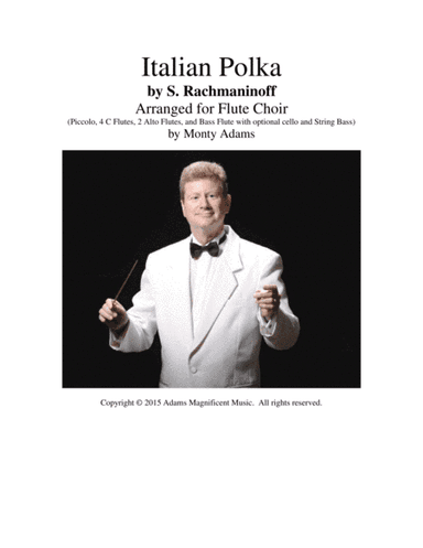 Woodwind Ensemble Flute - Level 3 - Digital Download SKU: A0.796442 Composed by Sergei Rachmaninoff. Arranged by Monty Adams. Concert,Romantic Period,World. 38 pages. Adams Magnificent Music #6207647. Published by Adams Magnificent Music (A0.796442). Italian Polka by Sergei Rachmaninoff was originally written for two pianos is now arranged for flute choir – Piccolo, 4 C flutes, 2 Alto flutes, and bass flute with optional cello and string bass parts.  This piece has a distinctive Russian sound. This product was created by a member of ArrangeMe, Hal Leonard's global self-publishing community of independent composers, arrangers, and songwriters. ArrangeMe allows for the publication of unique arrangements of popular titles and original compositions from a variety of voices and backgrounds. The length, difficulty, and retail pricing are determined solely by the discretion of the person who arranged or composed it. About Digital Downloads Digital Downloads are downloadable sheet music files that can be viewed directly on your computer, tablet or mobile device. Once you download your digital sheet music, you can view and print it at home, school, or anywhere you want to make music, and you don’t have to be connected to the internet. Just purchase, download and play! PLEASE NOTE: Your Digital Download will have a watermark at the bottom of each page that will include your name, purchase date and number of copies purchased. You are only authorized to print the number of copies that you have purchased. You may not digitally distribute or print more copies than purchased for use (i.e., you may not print or digitally distribute individual copies to friends or students).