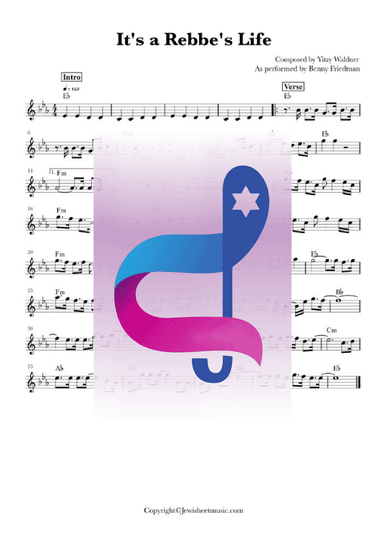 C Instrument - Level 2 - Digital Download SKU: A0.862265 By Benny Friedman. By Yitzy Waldner. Arranged by R. Sloboder. Hanukkah,Jewish,Multicultural,World. Lead Sheet / Fake Book. 2 pages. Rivka Sloboder #468766. Published by Rivka Sloboder (A0.862265). It‘s a Rebbe‘s Life by Benny Friedman | Lead sheet. Time: 4/4 Tempo: 143 Key: Eb Composer: Yitzy Waldldner. This product was created by a member of ArrangeMe, Hal Leonard's global self-publishing community of independent composers, arrangers, and songwriters. ArrangeMe allows for the publication of unique arrangements of popular titles and original compositions from a variety of voices and backgrounds. The length, difficulty, and retail pricing are determined solely by the discretion of the person who arranged or composed it. About Digital Downloads Digital Downloads are downloadable sheet music files that can be viewed directly on your computer, tablet or mobile device. Once you download your digital sheet music, you can view and print it at home, school, or anywhere you want to make music, and you don’t have to be connected to the internet. Just purchase, download and play! PLEASE NOTE: Your Digital Download will have a watermark at the bottom of each page that will include your name, purchase date and number of copies purchased. You are only authorized to print the number of copies that you have purchased. You may not digitally distribute or print more copies than purchased for use (i.e., you may not print or digitally distribute individual copies to friends or students).