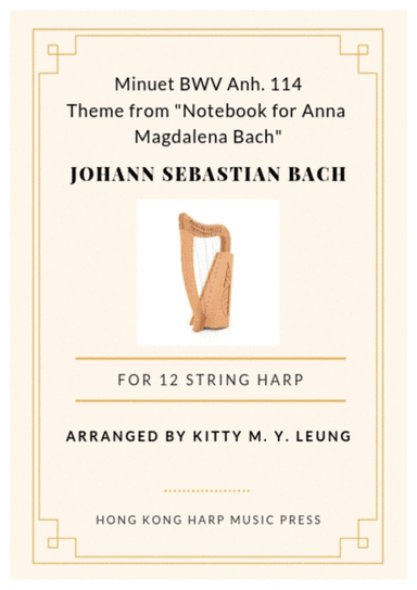 Harp - Level 1 - Digital Download SKU: A0.741560 Composed by Johann Sebastian Bach. Arranged by Kitty M. Y. Leung. Baroque,Instructional,Standards. Score. 3 pages. Kitty M.Y.Leung #3884867. Published by Kitty M.Y.Leung (A0.741560). J. S. Bach Minuet BWV Anh. 114- 12 String Small Lap Harp(also suitable for 13 /14 /15 /16 /17 /18 string harphttps://youtu.be/GwErh0bUJYI This product was created by a member of ArrangeMe, Hal Leonard's global self-publishing community of independent composers, arrangers, and songwriters. ArrangeMe allows for the publication of unique arrangements of popular titles and original compositions from a variety of voices and backgrounds. The length, difficulty, and retail pricing are determined solely by the discretion of the person who arranged or composed it. About Digital Downloads Digital Downloads are downloadable sheet music files that can be viewed directly on your computer, tablet or mobile device. Once you download your digital sheet music, you can view and print it at home, school, or anywhere you want to make music, and you don’t have to be connected to the internet. Just purchase, download and play! PLEASE NOTE: Your Digital Download will have a watermark at the bottom of each page that will include your name, purchase date and number of copies purchased. You are only authorized to print the number of copies that you have purchased. You may not digitally distribute or print more copies than purchased for use (i.e., you may not print or digitally distribute individual copies to friends or students).
