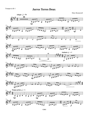 Concert Band - Level 2 - Digital Download SKU: A0.1042610 Composed by Mary Rounsavall. 20th Century,Contemporary,Contest,Festival,Instructional,Traditional. Score and parts. 2 pages. Mary Rounsavall #647383. Published by Mary Rounsavall (A0.1042610). Additional part for Bb Trumpet 1for the Concert Band arrangement of Jarres Terres Deux by Mary Rounsavall. This product was created by a member of ArrangeMe, Hal Leonard’s global self-publishing community of independent composers, arrangers, and songwriters. ArrangeMe allows for the publication of unique arrangements of both popular titles and original compositions from a wide variety of voices and backgrounds. About Digital Downloads Digital Downloads are downloadable sheet music files that can be viewed directly on your computer, tablet or mobile device. Once you download your digital sheet music, you can view and print it at home, school, or anywhere you want to make music, and you don’t have to be connected to the internet. Just purchase, download and play! PLEASE NOTE: Your Digital Download will have a watermark at the bottom of each page that will include your name, purchase date and number of copies purchased. You are only authorized to print the number of copies that you have purchased. You may not digitally distribute or print more copies than purchased for use (i.e., you may not print or digitally distribute individual copies to friends or students).