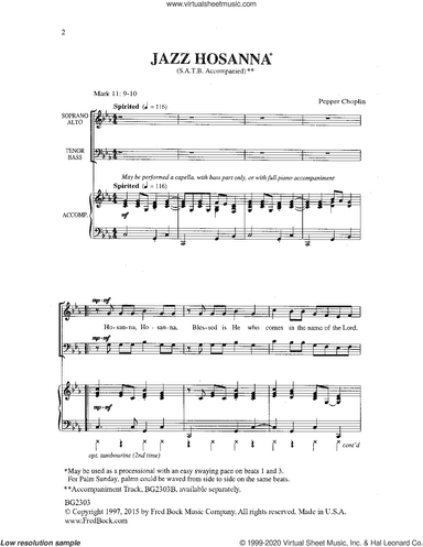 Choral (SATB Choir) SKU: HL.8738339 Composed by Pepper Choplin. SATB. Fred Bock Publications. Anthem, Palm Sunday, Sacred. Octavo. 6 pages. Fred Bock Music Company #BG2303. Published by Fred Bock Music Company (HL.8738339). UPC: 073999383393. 6.8x10.5 inches.Pepper Choplin has created a very creative, unique choral anthem for worship. This Palm Sunday piece effectively merges the traditional Hosannas with a jazz setting that is sure to bring excitement to any worship service.