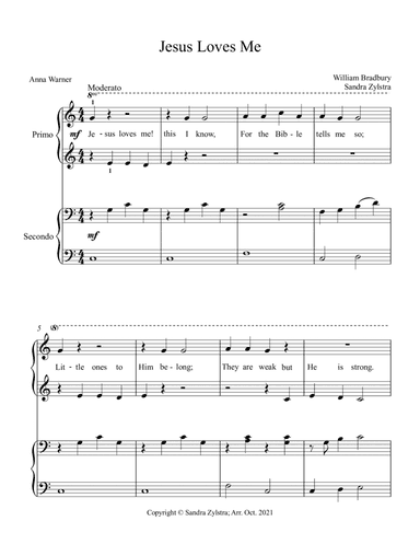 Easy Piano - Level 1 - Digital Download SKU: A0.712735 Composed by William B. Bradbury. Arranged by Sandra Zylstra. Children,Christian,Sacred. Score. 4 pages. Sandra dee zylstra #6607361. Published by sandra dee zylstra (A0.712735). Jesus Loves Me is arranged as a beginner solo with an optional elementary duet. This arrangement has both the stacked and separate scores included. When played as a duet the beginner part will be played one octave higher. You can also purchase the book Beginner Hymns & Spirituals which are 18 beginning solos with an optional elementary duet at: https://www.sheetmusicplus.com/title/beginner-hymns-spirituals-piano-solo-with-optional-elementary-d... You can look at other arrangements by Sandra Zylstra on Sheet Music Plus: http://www.sheetmusicplus.com/formats/singles/sandra-zylstra/600092+3001855 and at Piano Pronto: Composers Community https://pianopronto.com/composers-community/sandra-zylstra/. This product was created by a member of ArrangeMe, Hal Leonard's global self-publishing community of independent composers, arrangers, and songwriters. ArrangeMe allows for the publication of unique arrangements of popular titles and original compositions from a variety of voices and backgrounds. The length, difficulty, and retail pricing are determined solely by the discretion of the person who arranged or composed it. About Digital Downloads Digital Downloads are downloadable sheet music files that can be viewed directly on your computer, tablet or mobile device. Once you download your digital sheet music, you can view and print it at home, school, or anywhere you want to make music, and you don’t have to be connected to the internet. Just purchase, download and play! PLEASE NOTE: Your Digital Download will have a watermark at the bottom of each page that will include your name, purchase date and number of copies purchased. You are only authorized to print the number of copies that you have purchased. You may not digitally distribute or print more copies than purchased for use (i.e., you may not print or digitally distribute individual copies to friends or students).