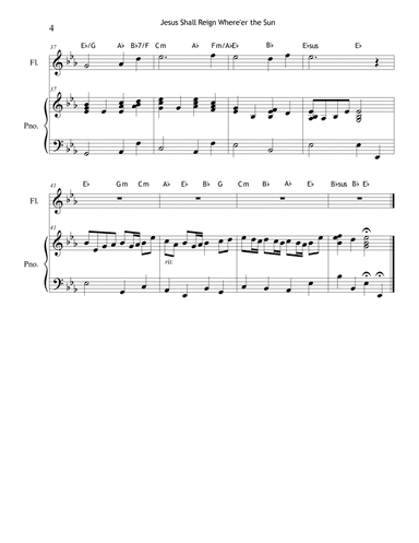 Flute,Piano - Level 3 - Digital Download SKU: A0.727647 Composed by Isaac Watts. Arranged by Carol Troutman Wiggins. Christian,Classical,Early Music,Easter,Sacred. Score and part. 1 pages. Carol Troutman Wiggins #6348225. Published by Carol Troutman Wiggins (A0.727647). Author: Isaac Watts (1719) Tune: DUKE STREET Published in 1677 hymnals "Jesus shall reign" reflects an 18th-century vision of the world church. Based on Psalm 72, Isaac Watts (1674-1748) paraphrased this psalm to reflect the rise of the British Empire. Easy instrumental part Intermediate piano accompaniment Beautiful contemporary harmonies Rehearsal track available This product was created by a member of ArrangeMe, Hal Leonard's global self-publishing community of independent composers, arrangers, and songwriters. ArrangeMe allows for the publication of unique arrangements of popular titles and original compositions from a variety of voices and backgrounds. The length, difficulty, and retail pricing are determined solely by the discretion of the person who arranged or composed it. About Digital Downloads Digital Downloads are downloadable sheet music files that can be viewed directly on your computer, tablet or mobile device. Once you download your digital sheet music, you can view and print it at home, school, or anywhere you want to make music, and you don’t have to be connected to the internet. Just purchase, download and play! PLEASE NOTE: Your Digital Download will have a watermark at the bottom of each page that will include your name, purchase date and number of copies purchased. You are only authorized to print the number of copies that you have purchased. You may not digitally distribute or print more copies than purchased for use (i.e., you may not print or digitally distribute individual copies to friends or students).