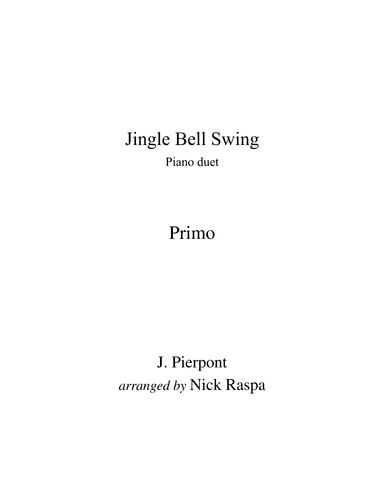 1 Piano,4 Hands,Piano Duet - Level 3 - Digital Download SKU: A0.754638 Composed by James Pierpont. Arranged by Nick Raspa. Christmas,Holiday,Jazz. Score. 4 pages. NJR Music #6715043. Published by NJR Music (A0.754638). This is the Primo part for the for the 1 piano 4 hands arrangement of Jingle Bell Swing. Listen to the entire arrangement on YouTube. The Secundo part is available separately at: Sheet Music DirectSheet Music Plus This product was created by a member of ArrangeMe, Hal Leonard's global self-publishing community of independent composers, arrangers, and songwriters. ArrangeMe allows for the publication of unique arrangements of popular titles and original compositions from a variety of voices and backgrounds. The length, difficulty, and retail pricing are determined solely by the discretion of the person who arranged or composed it. About Digital Downloads Digital Downloads are downloadable sheet music files that can be viewed directly on your computer, tablet or mobile device. Once you download your digital sheet music, you can view and print it at home, school, or anywhere you want to make music, and you don’t have to be connected to the internet. Just purchase, download and play! PLEASE NOTE: Your Digital Download will have a watermark at the bottom of each page that will include your name, purchase date and number of copies purchased. You are only authorized to print the number of copies that you have purchased. You may not digitally distribute or print more copies than purchased for use (i.e., you may not print or digitally distribute individual copies to friends or students).