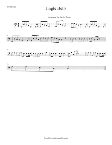Trombone Solo - Level 1 - Digital Download SKU: A0.604107 Arranged by Kevin Busse. Christmas. Individual part. 1 pages. Kevin Busse #3894385. Published by Kevin Busse (A0.604107). This is a simple transcription of Jingle Bells that has been modified for the Easy key of C for  Trombone This product was created by a member of ArrangeMe, Hal Leonard’s global self-publishing community of independent composers, arrangers, and songwriters. ArrangeMe allows for the publication of unique arrangements of both popular titles and original compositions from a wide variety of voices and backgrounds. About Digital Downloads Digital Downloads are downloadable sheet music files that can be viewed directly on your computer, tablet or mobile device. Once you download your digital sheet music, you can view and print it at home, school, or anywhere you want to make music, and you don’t have to be connected to the internet. Just purchase, download and play! PLEASE NOTE: Your Digital Download will have a watermark at the bottom of each page that will include your name, purchase date and number of copies purchased. You are only authorized to print the number of copies that you have purchased. You may not digitally distribute or print more copies than purchased for use (i.e., you may not print or digitally distribute individual copies to friends or students).