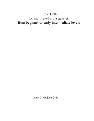 String Quartet String Quartet,Viola - Level 1 - Digital Download SKU: A0.805504 Composed by James Pierpont. Arranged by Laura C. Quijada Ortíz. Christmas. Score and parts. 10 pages. Laura Quijada #6629767. Published by Laura Quijada (A0.805504). Jingle Bells made fun to play for multilevel violists! From beginner to early intermediate performers, the four musicians can play together at once! This product was created by a member of ArrangeMe, Hal Leonard’s global self-publishing community of independent composers, arrangers, and songwriters. ArrangeMe allows for the publication of unique arrangements of both popular titles and original compositions from a wide variety of voices and backgrounds. About Digital Downloads Digital Downloads are downloadable sheet music files that can be viewed directly on your computer, tablet or mobile device. Once you download your digital sheet music, you can view and print it at home, school, or anywhere you want to make music, and you don’t have to be connected to the internet. Just purchase, download and play! PLEASE NOTE: Your Digital Download will have a watermark at the bottom of each page that will include your name, purchase date and number of copies purchased. You are only authorized to print the number of copies that you have purchased. You may not digitally distribute or print more copies than purchased for use (i.e., you may not print or digitally distribute individual copies to friends or students).