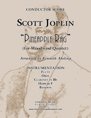 Woodwind Ensemble,Woodwind Quintet Bassoon,Clarinet,Flute,Horn,Oboe - Level 4 - Digital Download SKU: A0.514017 Composed by Scott Joplin. Arranged by Kenneth Abeling. 20th Century,Classical,Ragtime. 16 pages. LINCOLN MUSIC PUBLICATIONS #2931141. Published by LINCOLN MUSIC PUBLICATIONS (A0.514017). “Pineapple Rag”, transcribed here for Woodwind Quintet, is one of Scott Joplin's most popular rags. Audiences may recognize this melody from the Academy Award winning movie "The Sting". For hundreds of other arrangements by Kenneth Abeling at reduced prices please visit: www.lincolnmusicpublications.com Playing time: 3:30 Preview this score on YouTube: https://www.youtube.com/watch?v=VhtGBdWkNG8 This product was created by a member of ArrangeMe, Hal Leonard's global self-publishing community of independent composers, arrangers, and songwriters. ArrangeMe allows for the publication of unique arrangements of popular titles and original compositions from a variety of voices and backgrounds. The length, difficulty, and retail pricing are determined solely by the discretion of the person who arranged or composed it. About Digital Downloads Digital Downloads are downloadable sheet music files that can be viewed directly on your computer, tablet or mobile device. Once you download your digital sheet music, you can view and print it at home, school, or anywhere you want to make music, and you don’t have to be connected to the internet. Just purchase, download and play! PLEASE NOTE: Your Digital Download will have a watermark at the bottom of each page that will include your name, purchase date and number of copies purchased. You are only authorized to print the number of copies that you have purchased. You may not digitally distribute or print more copies than purchased for use (i.e., you may not print or digitally distribute individual copies to friends or students).