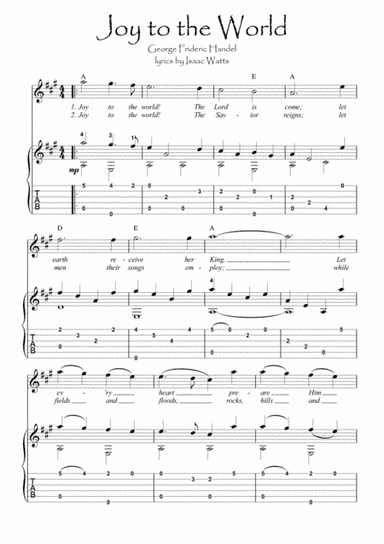 Instrumental Duet Flute,Guitar,Instrumental Duet - Level 1 - Digital Download SKU: A0.556520 Composed by George Frideric Handel. Arranged by PianoSheetNow. Christmas,Classical,Romantic Period. Score and parts. 3 pages. PianoSheetNow #3662341. Published by PianoSheetNow (A0.556520). "Joy to the World" is a popular Christmas carol with lyrics by Isaac Watts and music by G.F.Handel. As of the late 20th century, Joy to the World was the most published Christmas hymn in North America.For Flute and guitar duet.Easy.With downloadable mp3's for audio help (one with both the Flute and guitar and one with guitar only for practicing the flute). With guitar tablature. With melody line. With lyrics.Pages: three pages (score and Flute part) This product was created by a member of ArrangeMe, Hal Leonard’s global self-publishing community of independent composers, arrangers, and songwriters. ArrangeMe allows for the publication of unique arrangements of both popular titles and original compositions from a wide variety of voices and backgrounds. About Digital Downloads Digital Downloads are downloadable sheet music files that can be viewed directly on your computer, tablet or mobile device. Once you download your digital sheet music, you can view and print it at home, school, or anywhere you want to make music, and you don’t have to be connected to the internet. Just purchase, download and play! PLEASE NOTE: Your Digital Download will have a watermark at the bottom of each page that will include your name, purchase date and number of copies purchased. You are only authorized to print the number of copies that you have purchased. You may not digitally distribute or print more copies than purchased for use (i.e., you may not print or digitally distribute individual copies to friends or students).