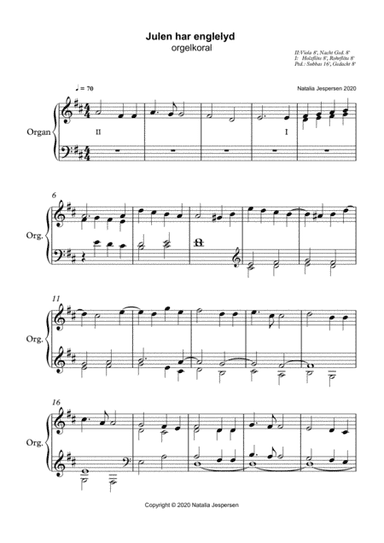 Organ - Level 2 - Digital Download SKU: A0.865206 Composed by Natalia Jespersen. Christmas. Score. 2 pages. Natalia Jespersen #6137797. Published by Natalia Jespersen (A0.865206). Quiet piece for organ based on Danish Christmas psalm. This product was created by a member of ArrangeMe, Hal Leonard’s global self-publishing community of independent composers, arrangers, and songwriters. ArrangeMe allows for the publication of unique arrangements of both popular titles and original compositions from a wide variety of voices and backgrounds. About Digital Downloads Digital Downloads are downloadable sheet music files that can be viewed directly on your computer, tablet or mobile device. Once you download your digital sheet music, you can view and print it at home, school, or anywhere you want to make music, and you don’t have to be connected to the internet. Just purchase, download and play! PLEASE NOTE: Your Digital Download will have a watermark at the bottom of each page that will include your name, purchase date and number of copies purchased. You are only authorized to print the number of copies that you have purchased. You may not digitally distribute or print more copies than purchased for use (i.e., you may not print or digitally distribute individual copies to friends or students).