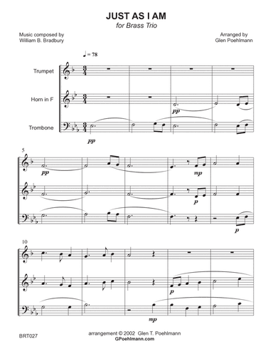 Brass Ensemble - Level 3 - Digital Download SKU: A0.807220 Composed by William B. Bradbury. Arranged by Glen Poehlmann. Christian,Sacred. Score and parts. 7 pages. Arrangements by GPoehlmann #6663487. Published by arrangements by GPoehlmann (A0.807220). JUST AS I AM - BRASS TRIO (Bb Trumpet, Horn in F or Trumpet 2, Trombone) - unaccompaniedHymn Tune: WOODWORTH45 measures.  Performance Time approx 1:45.  Medium in Difficulty (Grade 3)Key: Eb - G.   Meter: 3/4.  Instrument Ranges (C4=middle C):Bb Trumpet E4 - A5 (written)Horn in F D4 - G5 (written) or Bb Trumpet 2 A3 - D5 (written)Trombone Eb3 - E4PDF parts included: Score, Bb Trumpet, Horn in F, Trombone, Bb Trumpet 2 (sub for Horn). This product was created by a member of ArrangeMe, Hal Leonard's global self-publishing community of independent composers, arrangers, and songwriters. ArrangeMe allows for the publication of unique arrangements of popular titles and original compositions from a variety of voices and backgrounds. The length, difficulty, and retail pricing are determined solely by the discretion of the person who arranged or composed it. About Digital Downloads Digital Downloads are downloadable sheet music files that can be viewed directly on your computer, tablet or mobile device. Once you download your digital sheet music, you can view and print it at home, school, or anywhere you want to make music, and you don’t have to be connected to the internet. Just purchase, download and play! PLEASE NOTE: Your Digital Download will have a watermark at the bottom of each page that will include your name, purchase date and number of copies purchased. You are only authorized to print the number of copies that you have purchased. You may not digitally distribute or print more copies than purchased for use (i.e., you may not print or digitally distribute individual copies to friends or students).