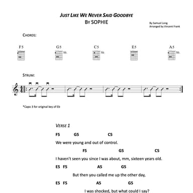 Guitar - Level 2 - Digital Download SKU: A0.1354782 Composed by Samuel Long. Arranged by Vincent Frank. Pop,Rock,Singer/Songwriter,Video Game. Chords/Lyrics. 4 pages. Vincent Frank Music #939484. Published by Vincent Frank Music (A0.1354782). Guitar Chord Sheet arrangement of SOPHIE's "Just Like We Never Said Goodbye" from 2015 album Product. Inlcudes lyrics, chords (this song uses exclusively power chords, or "5" chords), fretboard diagrams and the main strum pattern. Key of C, Capo 3 for original key of Eb. 4 pages. This product was created by a member of ArrangeMe, Hal Leonard’s global self-publishing community of independent composers, arrangers, and songwriters. ArrangeMe allows for the publication of unique arrangements of both popular titles and original compositions from a wide variety of voices and backgrounds. About Digital Downloads Digital Downloads are downloadable sheet music files that can be viewed directly on your computer, tablet or mobile device. Once you download your digital sheet music, you can view and print it at home, school, or anywhere you want to make music, and you don’t have to be connected to the internet. Just purchase, download and play! PLEASE NOTE: Your Digital Download will have a watermark at the bottom of each page that will include your name, purchase date and number of copies purchased. You are only authorized to print the number of copies that you have purchased. You may not digitally distribute or print more copies than purchased for use (i.e., you may not print or digitally distribute individual copies to friends or students).