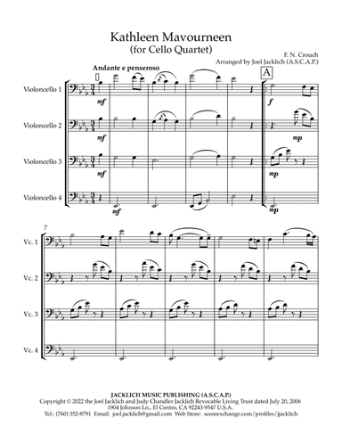 String Quartet Cello,String Quartet - Digital Download SKU: A0.726178 Composed by F. N. Crouch. Arranged by Joel Jacklich (ASCAP). Celtic,Folk,World. Score and parts. 22 pages. Joel Jacklich #6690507. Published by Joel Jacklich (A0.726178). The Irish air "Kathleen Mavourneen" is here arranged for cello quartet by Joel Jacklich (A.S.C.A.P.). This product was created by a member of ArrangeMe, Hal Leonard's global self-publishing community of independent composers, arrangers, and songwriters. ArrangeMe allows for the publication of unique arrangements of popular titles and original compositions from a variety of voices and backgrounds. The length, difficulty, and retail pricing are determined solely by the discretion of the person who arranged or composed it. About Digital Downloads Digital Downloads are downloadable sheet music files that can be viewed directly on your computer, tablet or mobile device. Once you download your digital sheet music, you can view and print it at home, school, or anywhere you want to make music, and you don’t have to be connected to the internet. Just purchase, download and play! PLEASE NOTE: Your Digital Download will have a watermark at the bottom of each page that will include your name, purchase date and number of copies purchased. You are only authorized to print the number of copies that you have purchased. You may not digitally distribute or print more copies than purchased for use (i.e., you may not print or digitally distribute individual copies to friends or students).