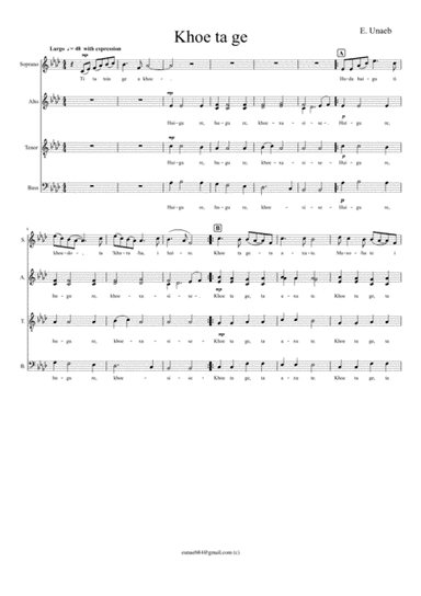 Choral Choir (SATB) - Level 4 - Digital Download SKU: A0.1015041 Composed by Engelhardt Unaeb. Contemporary. Octavo. 3 pages. Engelhardt Unaeb #4763179. Published by Engelhardt Unaeb (A0.1015041). A piece written in my mother-tongue, Khoekhoegowab, simply translating: I am also human. Have humility.Let's help each other, don't just past by.I am a human, don't throw me away, stand by me.Let's help each other, have humility. This product was created by a member of ArrangeMe, Hal Leonard’s global self-publishing community of independent composers, arrangers, and songwriters. ArrangeMe allows for the publication of unique arrangements of both popular titles and original compositions from a wide variety of voices and backgrounds. About Digital Downloads Digital Downloads are downloadable sheet music files that can be viewed directly on your computer, tablet or mobile device. Once you download your digital sheet music, you can view and print it at home, school, or anywhere you want to make music, and you don’t have to be connected to the internet. Just purchase, download and play! PLEASE NOTE: Your Digital Download will have a watermark at the bottom of each page that will include your name, purchase date and number of copies purchased. You are only authorized to print the number of copies that you have purchased. You may not digitally distribute or print more copies than purchased for use (i.e., you may not print or digitally distribute individual copies to friends or students).