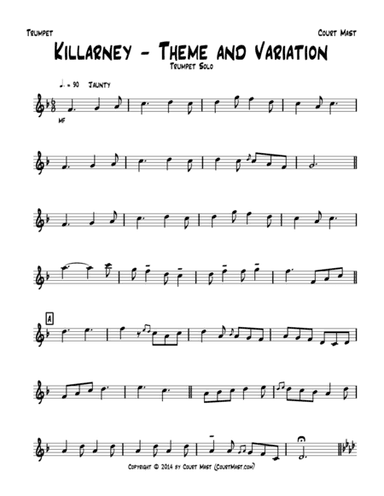 B-Flat Trumpet Solo - Level 4 - Digital Download SKU: A0.800680 Composed by Court Mast. Contemporary,Contest,Festival,Folk,Instructional,Pop. Individual part. 2 pages. Court Mast #2020639. Published by Court Mast (A0.800680). Killarney is a jaunty, lilting Irish air in E-flat concert (F for trumpet). The pretty major melody from the Theme moves to minor in the Variation, evoking a sad and melancholy longing. A study in contrasts, Killarney is not technically difficult but fairly challenging emotionally. This product was created by a member of ArrangeMe, Hal Leonard's global self-publishing community of independent composers, arrangers, and songwriters. ArrangeMe allows for the publication of unique arrangements of popular titles and original compositions from a variety of voices and backgrounds. The length, difficulty, and retail pricing are determined solely by the discretion of the person who arranged or composed it. About Digital Downloads Digital Downloads are downloadable sheet music files that can be viewed directly on your computer, tablet or mobile device. Once you download your digital sheet music, you can view and print it at home, school, or anywhere you want to make music, and you don’t have to be connected to the internet. Just purchase, download and play! PLEASE NOTE: Your Digital Download will have a watermark at the bottom of each page that will include your name, purchase date and number of copies purchased. You are only authorized to print the number of copies that you have purchased. You may not digitally distribute or print more copies than purchased for use (i.e., you may not print or digitally distribute individual copies to friends or students).