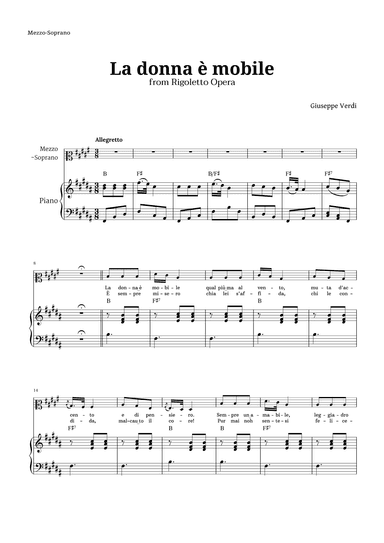 Piano,Vocal,Voice - Level 2 - Digital Download SKU: A0.1236294 Composed by Giuseppe Verdi. Arranged by Langanho. 19th Century,Classical,Romantic Period. Score. 2 pages. Avery Lynn Jordan #831807. Published by Avery Lynn Jordan (A0.1236294). We present to you the sheet music of a special arrangement of the famous aria "La donna è mobile" by Verdi, carefully reduced for mezzo-soprano in its clef and piano in the original key. With simplified piano accompaniment, this sheet music is ideal for teachers who wish to use it as educational material in their classes, as well as for students who want to enhance their repertoire. "La donna è mobile" is one of the most well-known arias from Verdi's opera "Rigoletto," composed by the renowned Giuseppe Verdi. This sheet music offers the possibility to explore this masterpiece of romantic music in an accessible way, allowing both beginner and experienced singers to appreciate and interpret this beautiful composition. Take advantage of this opportunity to acquire the best product in the market, which provides high-quality sheet music. Don't miss the chance to enrich your repertoire and improve your musical skills. Purchase this sheet music of "La donna è mobile" now and enjoy a unique musical experience! This product was created by a member of ArrangeMe, Hal Leonard's global self-publishing community of independent composers, arrangers, and songwriters. ArrangeMe allows for the publication of unique arrangements of popular titles and original compositions from a variety of voices and backgrounds. The length, difficulty, and retail pricing are determined solely by the discretion of the person who arranged or composed it. About Digital Downloads Digital Downloads are downloadable sheet music files that can be viewed directly on your computer, tablet or mobile device. Once you download your digital sheet music, you can view and print it at home, school, or anywhere you want to make music, and you don’t have to be connected to the internet. Just purchase, download and play! PLEASE NOTE: Your Digital Download will have a watermark at the bottom of each page that will include your name, purchase date and number of copies purchased. You are only authorized to print the number of copies that you have purchased. You may not digitally distribute or print more copies than purchased for use (i.e., you may not print or digitally distribute individual copies to friends or students).