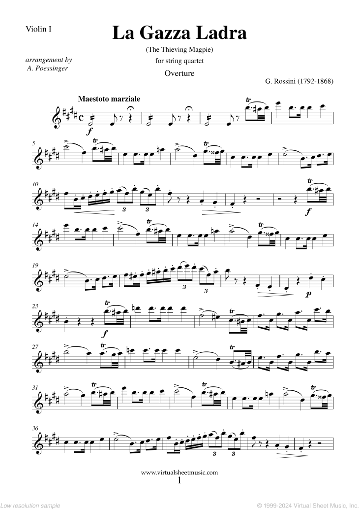 Virtual Sheet Music® Premium High-Quality digital sheet music for string quartet, "The Thieving Magpie", Overture, Full Score & Single Parts, arrangement by A.Poessinger.Publisher: Virtual Sheet MusicThis item includes: PDF (digital sheet music to download and print), Interactive Sheet Music (for online playing, transposition, instrument change, etc.) and MusicXML export via Playground. NOTE: MusicXML export available to Members only. This item also includes: Videos, MIDI and Mp3 audio files (including Mp3 music accompaniment tracks to play along)*Once you buy or access this item as a Member, you'll be able to download everything included as a single .zip file.Instrumentation:string quartetFormat:digital sheet musicSkill Level:advancedGenre:classicalKey Signature:E majorTime Signature:4/4Tempo:♩=104 BPMDuration:20' 34"Total Pages:64