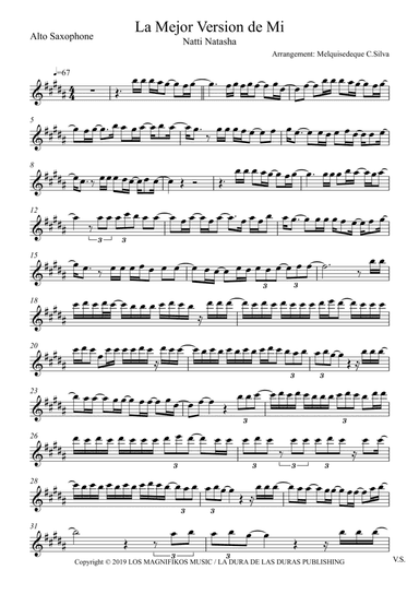 Alto Saxophone Solo - Level 2 - Digital Download SKU: A0.943355 By Natti Natasha. By Jose Alberto Inzunza Favela, Natalia Gutierrez, and Rafael Nieves Pina. Arranged by Melquisedeque C.Silva. Contemporary. Individual part. 2 pages. Melquisedeque C.Silva #6445891. Published by Melquisedeque C.Silva (A0.943355). This product was created by a member of ArrangeMe, Hal Leonard’s global self-publishing community of independent composers, arrangers, and songwriters. ArrangeMe allows for the publication of unique arrangements of both popular titles and original compositions from a wide variety of voices and backgrounds. About Digital Downloads Digital Downloads are downloadable sheet music files that can be viewed directly on your computer, tablet or mobile device. Once you download your digital sheet music, you can view and print it at home, school, or anywhere you want to make music, and you don’t have to be connected to the internet. Just purchase, download and play! PLEASE NOTE: Your Digital Download will have a watermark at the bottom of each page that will include your name, purchase date and number of copies purchased. You are only authorized to print the number of copies that you have purchased. You may not digitally distribute or print more copies than purchased for use (i.e., you may not print or digitally distribute individual copies to friends or students).