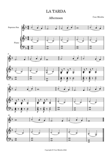 Piano,Soprano Saxophone - Level 1 - Digital Download SKU: A0.1160069 By Cesc Miralta. By Cesc Miralta. Arranged by Cesc Miralta. Children,Classical. Score and part. 3 pages. Cesc Miralta #760344. Published by Cesc Miralta (A0.1160069). Composition for beginner children. SOPRANO SAXOPHONE and PIANO. Soprano Saxophone playing range G3 to C4 G Major (for sax) This product was created by a member of ArrangeMe, Hal Leonard's global self-publishing community of independent composers, arrangers, and songwriters. ArrangeMe allows for the publication of unique arrangements of popular titles and original compositions from a variety of voices and backgrounds. The length, difficulty, and retail pricing are determined solely by the discretion of the person who arranged or composed it. About Digital Downloads Digital Downloads are downloadable sheet music files that can be viewed directly on your computer, tablet or mobile device. Once you download your digital sheet music, you can view and print it at home, school, or anywhere you want to make music, and you don’t have to be connected to the internet. Just purchase, download and play! PLEASE NOTE: Your Digital Download will have a watermark at the bottom of each page that will include your name, purchase date and number of copies purchased. You are only authorized to print the number of copies that you have purchased. You may not digitally distribute or print more copies than purchased for use (i.e., you may not print or digitally distribute individual copies to friends or students).
